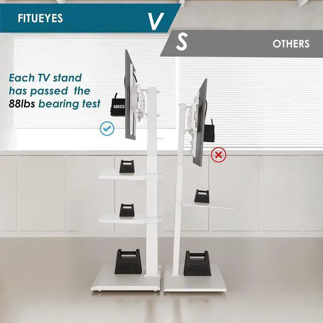 Inch TVs: FITUEYES universal TV stand with mount is compatible with most 32 37 43 46 50 55 60 65 75 inch plasma LCD LED OLED Plasma Flat Panel or Curved Screen TVs. Please make sure your TVs VESA mounting holes fall between 100 (w) x100 (h) to 600 (w) x400 (h) mmEasy Assembly with