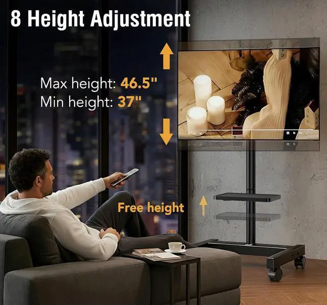 Height Adjustment: This floor tv stand have -10° to +10° screen tilt and 8 height setting from 37 to 46.5 for optimal viewing angles. You can adjust angle and height of the tv according to your sitting posture to reduce glare and improve the viewing experienceSturdy