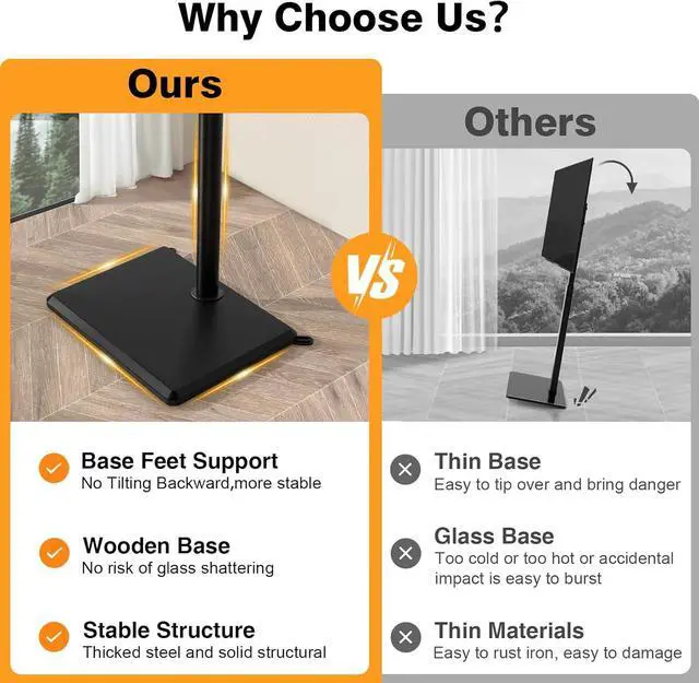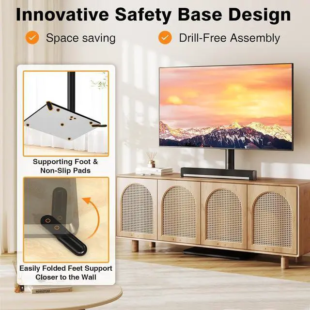 70° SWIVEL & HEIGHT ADJUSTMENT OPTIMIZE YOUR VIEWING COMFORTEnjoy flexible viewing with a 70° swivel range allowing you to easily reduce glare and share the screen from different spots in the room. This standing TV stand also offers 3 height adjustments (from 51.7 to 54) letting you align the TV with your eye level whether you're on a sofa or a chair for a more comfortable and immersive experience. INNOVATIVE ANTI-TIP DESIGN ENGINEERED FOR SUPERIOR SAFETYOur standout safety feature is the reinforced base with 45-degree angled rear supports. This strategic design significantly increases stability prevents leaning and effectively withstands lateral forces or accidental bumps.
