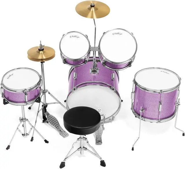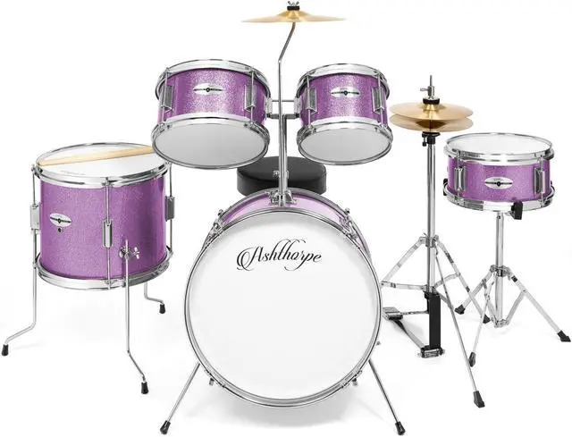 Introduce your aspiring young musician to the wonders of music with this premium Ashthorpe 5-piece junior drum set. Ideally for beginner musicians, this professional-style junior set is the perfect way to allow free reign to experiment and practice playing, and is a fantastic upgrade from traditional plastic drum sets. Featuring hardwood Poplar shells, triple flanged hoops, upgraded brass cymbals, chrome accents and finished with a glossy, vibrant exterior, these drums provide impressive sound in an aesthetically pleasing design that will delight young aspiring musicians. This Ashthorpe drum set looks like and compares to a full-sized adult set, making it a favorite for grown-up musicians who love engaging in teacher-student play time, each on their own respective set! This drum set includes all instruments and hardware you need to get started.
