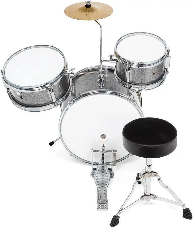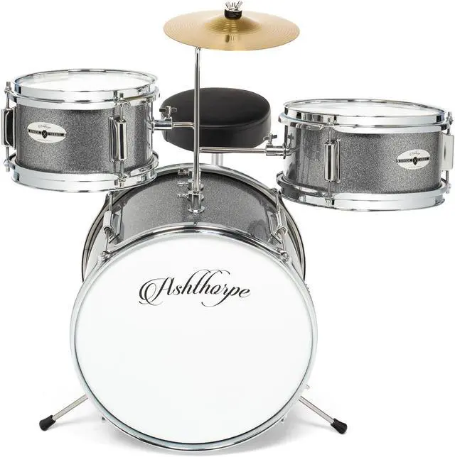 Ashthorpe 3-Piece Complete Kids Drum Set - Beginner Kit with 14" Bass, Adjustable Throne, Cymbal, Pedal & Drumsticks - Silver