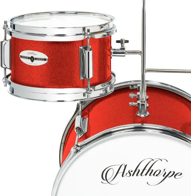 Introduce your aspiring young musician to the wonders of music with this Ashthorpe 3-piece junior drum set. Ideally for aspiring young musicians, this junior set is the perfect way to allow free reign to experiment and practice playing, and is a fantastic upgrade from traditional plastic drum sets. Featuring hardwood Poplar shells, triple flanged hoops, chrome accents and finished with a glossy, vibrant exterior, these drums provide impressive sound in an aesthetically pleasing design that will delight young aspiring musicians. This Ashthorpe drum set looks like and compares to a full-sized adult set, making it a favorite for grown-up musicians who love engaging in teacher-student play time, each on their own respective set! This drum set includes all instruments and hardware you need to get started.