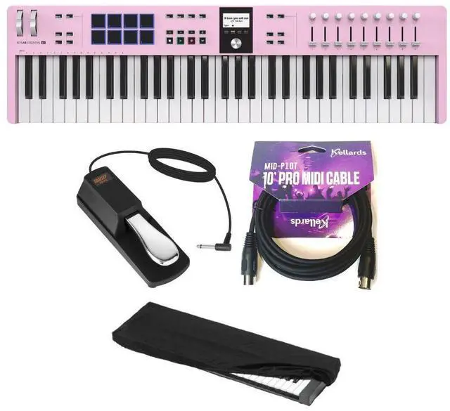 Musicians, producers, and sound designers looking for a quality keyboard controller with custom DAW integration and an expanded software package should check out the rose quartz Arturia KeyLab Essential mk3, a universal MIDI controller and software package that features 61 synth-action, velocity-sensitive keys, a clickable encoder, nine additional encoders, nine sliders, eight touch and pressure sensitive pads, six transport control switches, four command switches, a modulation wheel, and a pitchbend wheel. The system is designed to provide 1:1 control of the included Analog Lab V synth software, Ableton Live Lite, UVI Grand Piano Model D, and Native Instruments The Gentleman upright piano software as well as any MIDI controllable plug-in or DAW. It can be customized to other software using the downloadable MIDI Control Center software. What's more, the KeyLab Essential utilizes MCU and HUI protocols for its DAW command center, which offers seamless control well beyond standard MIDI, allowing you to control your DAW software on any platform. The controller is a Class-Compliant USB device, what works straight out of the box with Mac and Windows computers. Bundle with Auray FP-P1L Universal Piano-Style Sustain Pedal, MID-P10T Pro MIDI to MIDI Cable 10 Feet, Kaces KKC-MD Stretchy Keyboard Dust Cover, medium.