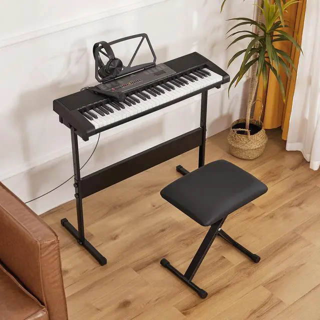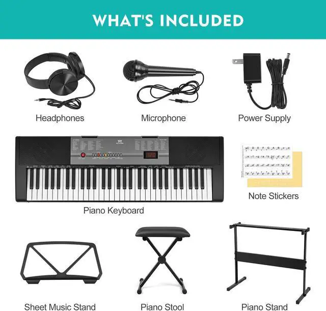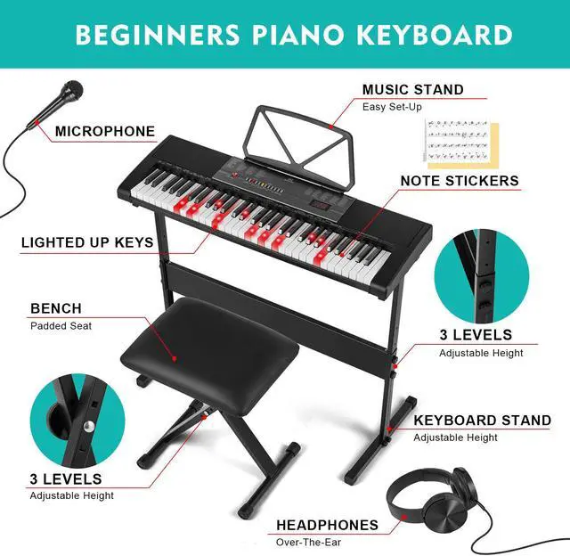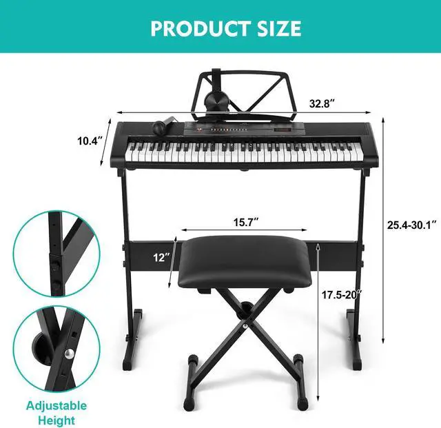 Super Value Piano Kit - The whole kit comes with 1*61 keys piano keyboard, 1*bench, 1*stand, 1*headphones, 1*microphone, 1*note stickers, 1*sheet music stand and 1*power adapter. Lighted up keyboard piano body size: 32.8 x 10.4 x 3.4 inches, adjustable stand height from 25.4-30.1 in, meeting the need of different learning. The bench contains a padded seat that is easily folded and allows for hours of comfortable play.
