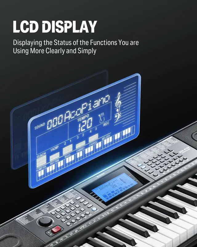 HD Display-The 61-key beginner keyboard piano features an LCD display panel that shows the current functions and operations