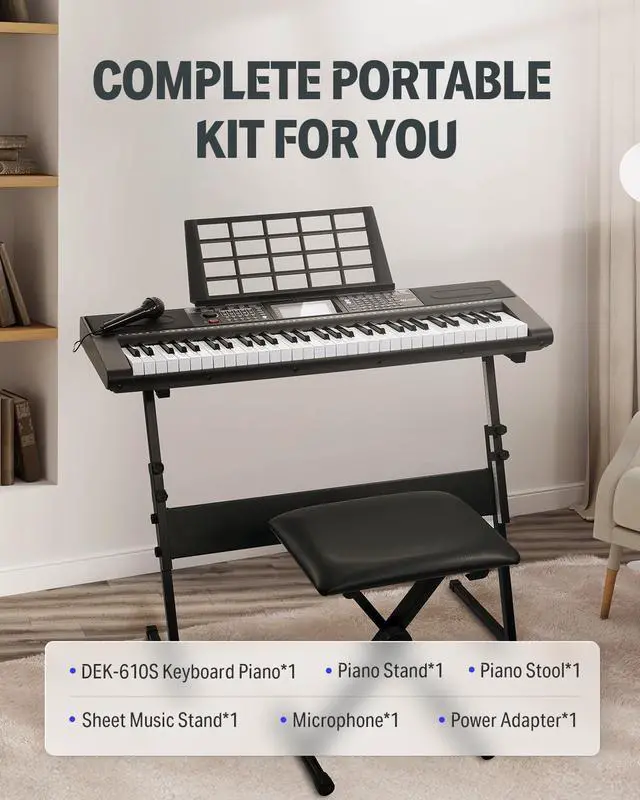 All-Inclusive Kit-The DEK-610S Piano Keyboard Kit includes an easy-to-assemble keyboard stand, an adjustable-height bench, a sheet music stand, a microphone, and a power adapter. It provides everything you need in one package