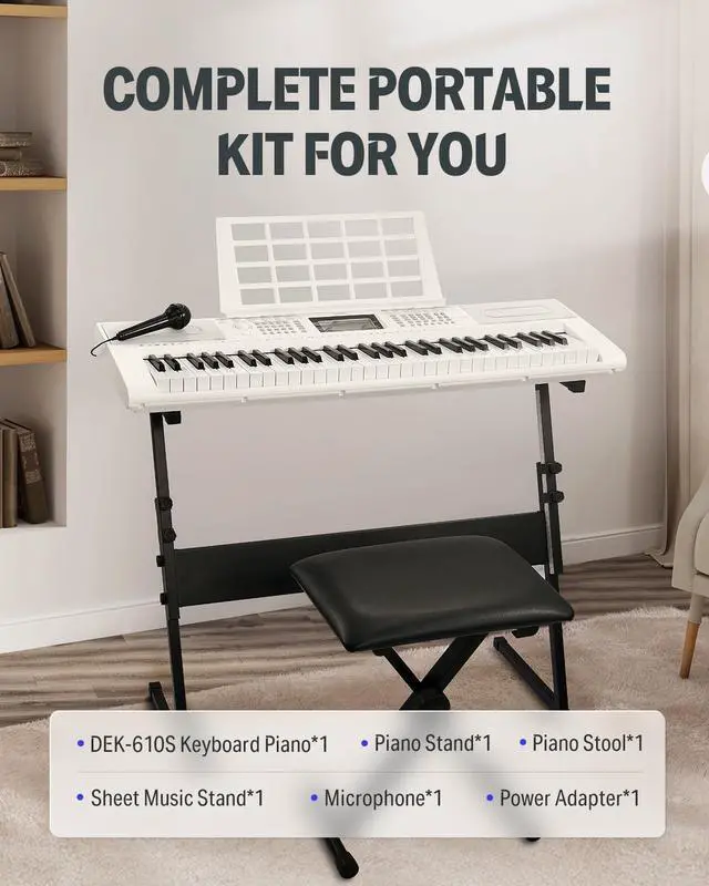 All-Inclusive Kit-The DEK-610S Piano Keyboard Kit includes an easy-to-assemble keyboard stand, an adjustable-height bench, a sheet music stand, a microphone, and a power adapter. It provides everything you need in one package