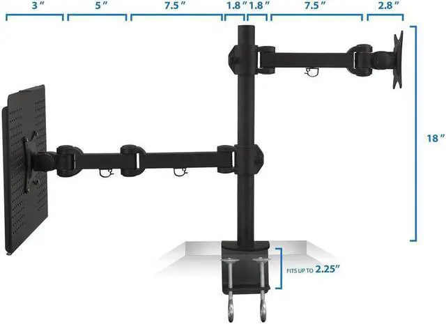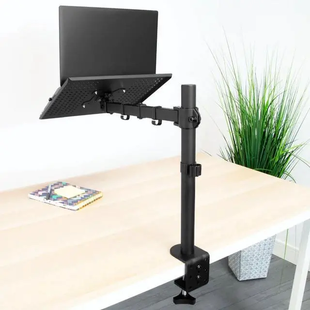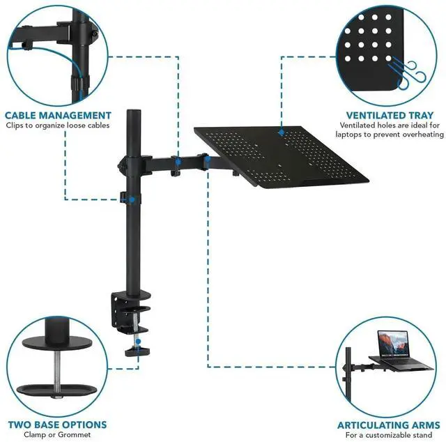 This universal laptop arm works with most laptops on the market. It supports the weight of your laptop or notebook up to 22lbs. The integrated cable management will keep your cables clean and organized.