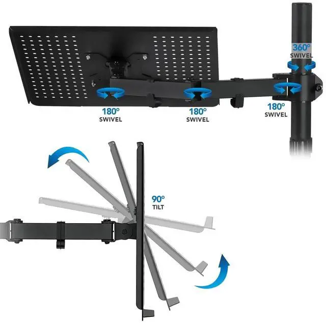 FULL MOTION DESIGN - Full motion capability allows the user to move the laptop closer or farther away, as well as turning it left and right. The arms holding the tray can be lifted or lowered on the 17.7 inch high pole. Cable management clips helps organize cables running to the computer.
