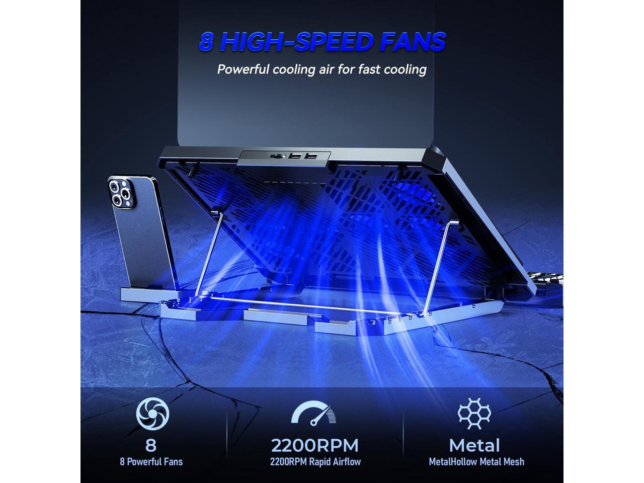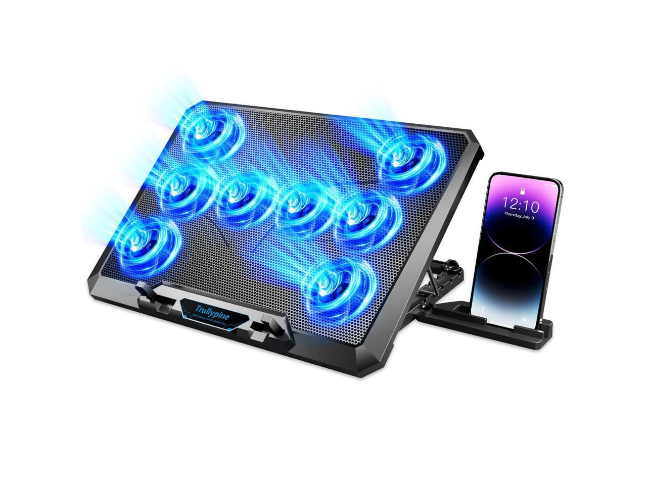 Updated Gaming Laptop Cooling Pad with 8 Cooling Fans, Laptop Fan Cooler Pad for 15-17.3 Inch, Notebook Cooler Stand with 5 Height Adjustable, Ultra Thin Cooling Pad with Two USB Port + Phone Stand
