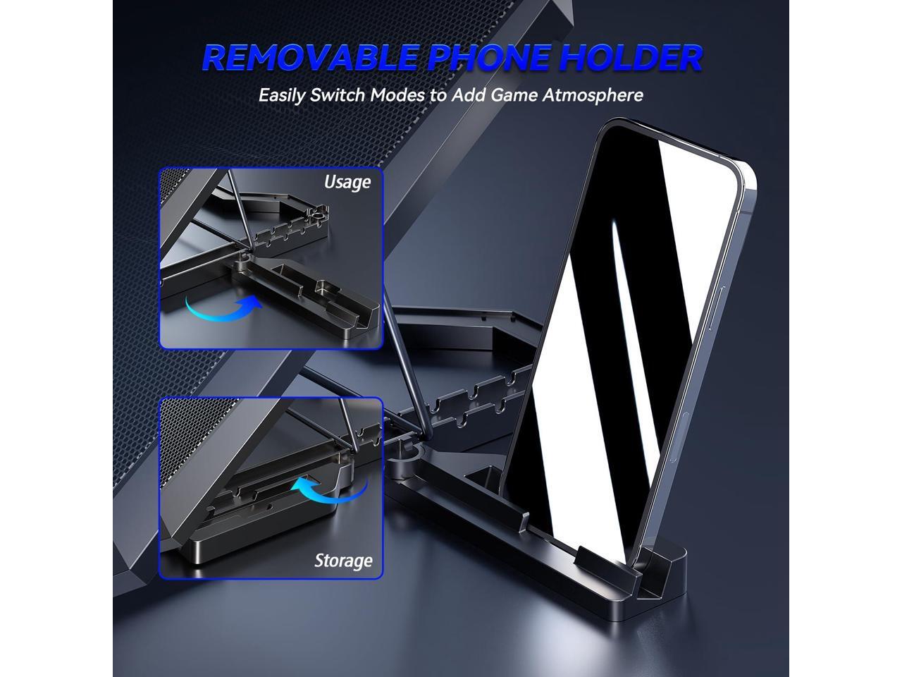 - Anti-Slip Baffles & Phone Holder-Two foldable baffles prevent your laptop from sliding, while four rubber pads keep the pad in place. includes a removable phone holder that hides behind the cooling pad for laptop when not in use.