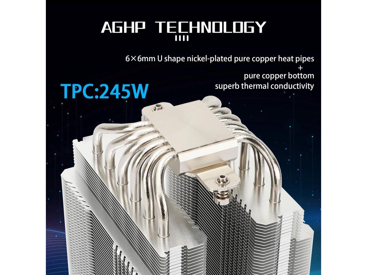 - AGHP technique6×6mm heat pipes apply AGHP technique, Solve the Inverse gravity effect caused by vertical / horizontal orientation, cpu cooler TDP is 245W.