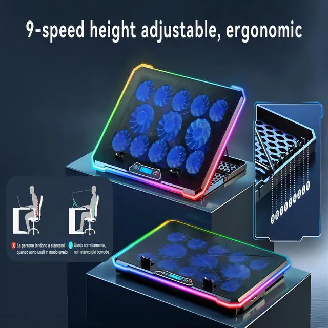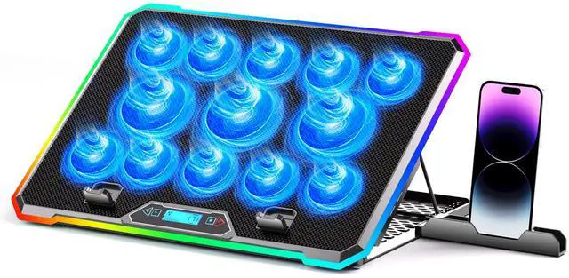 Proven Cooling: 13-fan design outperforms standard 5-fan coolers by 3X Zero Light Pollution: Industry-first long-press RGB off function All-Day Comfort: 9-angle tilt + 4.5cm phone holder for true multitasking Plug-&-Play: No drivers/softwareworks instantly with Windows, Mac, Linux Compatibility: 15-21 inch laptops (Max load: 22 lbs / 10 kg) USB Ports: 2 × USB 2.0 (Data + Power) Noise Level: 18 dB (Lowest setting) Material: Aerospace-grade ABS + silicone grips Warranty: 24-month hassle-free replacement