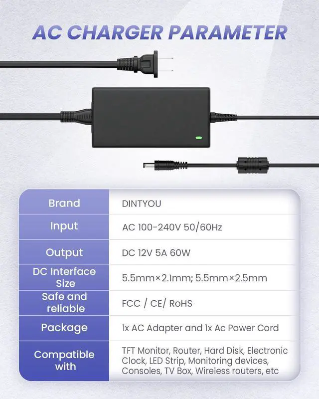 | Output | 12V DC, 5A Max( Compatible with 2A, 2.5A, 3A, 3.5A, 4A ) |