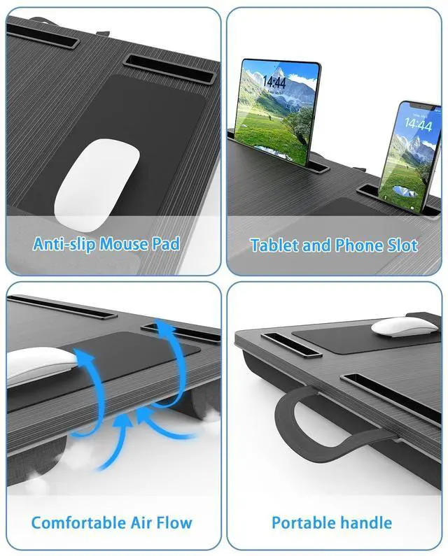 Merchant VideoHETTHI Lap Desk with cushion with enough room for a 17-inch laptop and mouse, built-in wrist rest and upholstered bottom so you can work or use for long hours without discomfort. Its lightweight, portable design is suitable for students, professionals and busy individuals.