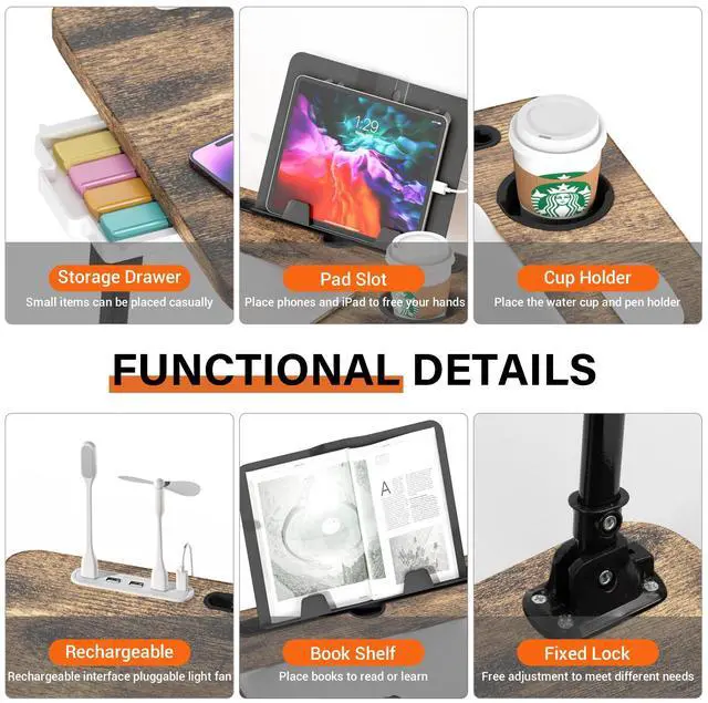 | Included Components | USB Port, Cup Holder, Storage Drawer, Tablet Stand, Bookshelf, Non-Slip Pads |