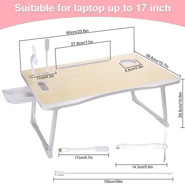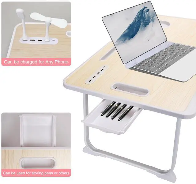 CSYY USB Bed Table Laptop Desk, Foldable Laptop Bed Tray, Lap Desk Portable Notebook Stand Reading Holder with USB Port, Handle, Desktop Card Slot, Cup Slot, Side Drawer for Couch Sofa Floor