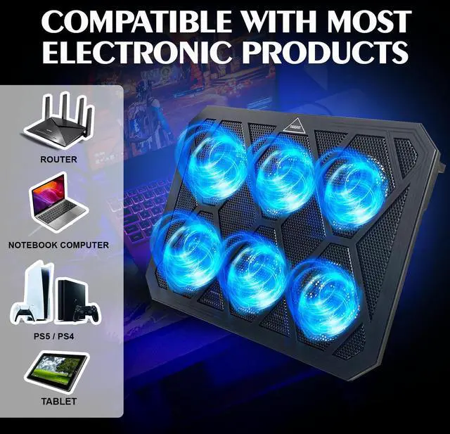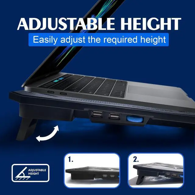 NAGAN gaming laptop cooling pad, engineered to elevate your laptop experience to the next level. With a robust configuration of 6 powerful fans, this cooling pad ensures optimal cooling performance.Equipped with dual USB ports, the NAGAN Cooling Pad offers enhanced connectivity, allowing you to conveniently plug in additional devices while effectively cooling your laptop. Customize your setup with adjustable height settings, offering a comfortable viewing angle and ergonomic typing experience tailored to your preferences. Whether you're working, gaming, or streaming content, the NAGAN Cooling Pad ensures optimal comfort and performance. Experience tranquility in action with whisper-quiet fans that minimize noise disturbance, enabling you to focus on your tasks without distraction. Crafted specifically for gaming notebook cooler, this cooling pad is compatible with 14-17inch laptops, delivering efficient cooling solutions for your gaming rig. Powered by USB for ultimate convenience, the NAGAN Laptop Cooling Pad is your essential companion for a cooler, smoother laptop experience