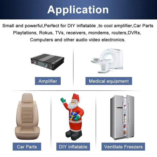 Small and powerful,,Perfect for DIY inflatable ,to cool amplifier ,Car Parts, Playtations, Rokus, TVs, receivers, mondems, routers, DVRs, Computers and other audio video electronics.