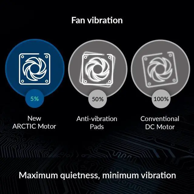 The operating noise of the newly-developed ARCTIC motor is barely perceptible, even at the lowest speed. Thanks to its special magnetization, the motor of the P-fans generates no start-up jerks and only a fraction of the commutation vibrations of a conventional DC motor. As a result, there is far less vibration on the housing at different speeds and no need for rubber buffering or additional decoupling.