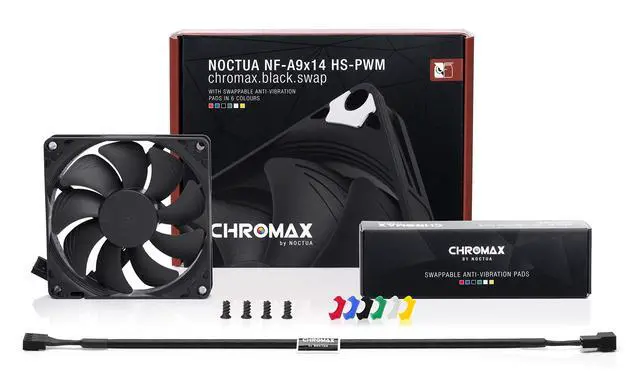 Having received dozens of awards and recommendations from international hardware websites and magazines, the NF-A9x14 has established itself as a default choice when it comes to premium-quality slim 92mm fans. The chromax.black.swap edition combines the NF-A9x14’s signature quiet cooling performance with an attractive all-black design and a bundle of self-adhesive red, white, blue, green, yellow and black anti-vibration pads that allow the colour-customisation of the fan to match individual build colour schemes. Topped off with Noctua’s trusted premium-grade SSO2 bearing and more than 150,000 hours MTTF, the NF-9x14 PWM chromax.black.swap is the perfect choice for all users who value individual, focused build aesthetics just as much as class-leading quality and performance.