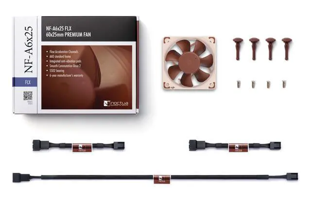 Featuring advanced aerodynamic design measures such as Flow Acceleration Channels and Noctua’s AAO frame, the NF-A6x25 FLX is a highly optimised, premium quality quiet fan in 60x25mm size. Smooth Commutation Drivetechnology and Noctua’s reference class SSO2 bearings ensure superb running smoothness and excellent long-term stability. Topped off with modular cabling and Low-Noise Adaptors, the NF-A6x25 is a premium choice for the highest demands.