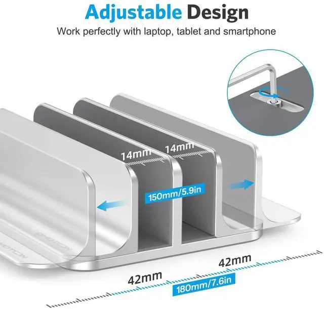 ![Alt view image 7 of 7 - Vertical Laptop Stand [Updated Double Version], Desktop Aluminum Mac Book Stand with Adjustable Dock Size, Fits All Mac Book, Surface, Chrome Book and Gaming Laptops (Up to 17.3 inch) (Silver)](https://c1.neweggimages.com/productimage/nb640/C5JMD26030607EJO940.jpg)