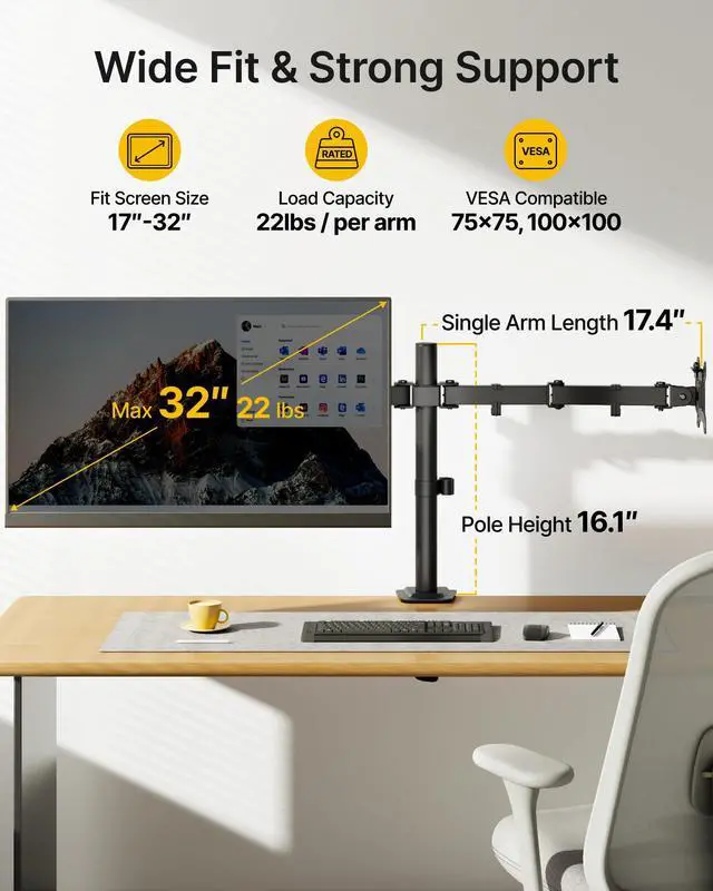 Universal Fit for 17"32 Screens: Designed to hold most computer monitors up to 32 inches and 22 lbs per arm, with VESA 75×75mm and 100×100mm compatibility for wide brand coverage.