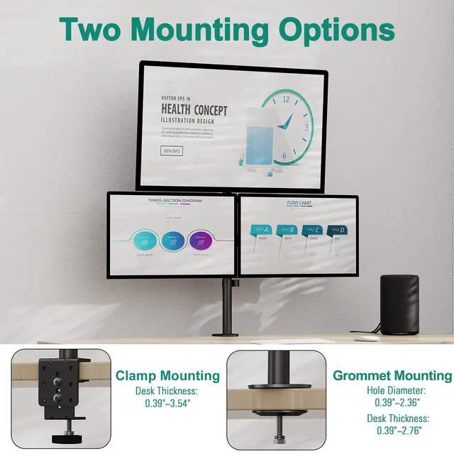 Desk Space Saver : Vertical monitor desk mount elevates your monitors up without taking up your valuable desk space, fits most of desk thickness of 0.39"-3.45"(C-clamp option) or 0.39-2.76", and hole diameter of 0.39-2.36"(Grommet option). Integrated cable management to keep cables tucked in arm neatly