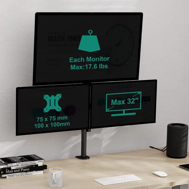 Triple Monitor Stand, Desk Mount for Three Screens up to 32 Inch, Stacked Monitor Arm for 3 Monitors Max 17.6 lbs per Arm, Height Adjustable, Tilt, Swivel VESA Mount 75/100x100mm