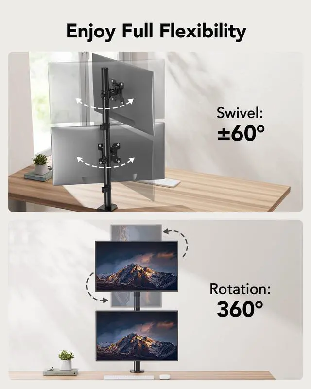 Engineered with ??360° buttery-smooth rotation??, ??fluid 60° swivel??, and ??45° tilt??, this mount lets you effortlessly fine-tune your screen to your posture.