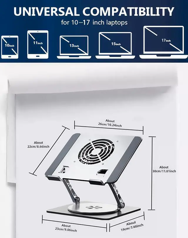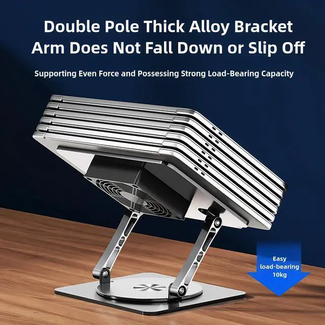 This stand boosts productivity with seamless 360° rotation and a high-powered turbine fan that directly targets laptop core heat zones, improving cooling efficiency by 60%. USB-A/Type-C connectivity and one-touch controls ensure effortless operation