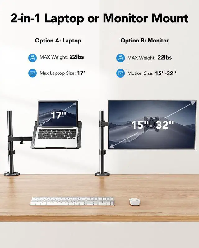 Our laptop arm mount for desk can also function as a monitor stand with +/45° tilt, +/-90° swivel, and 360° rotation. With a tall 16.73? pole, you can set your screen at the perfect height for comfortable, eye-level viewing. Experience true screen freedom with a monitor mount that does it all.