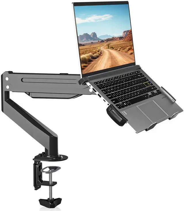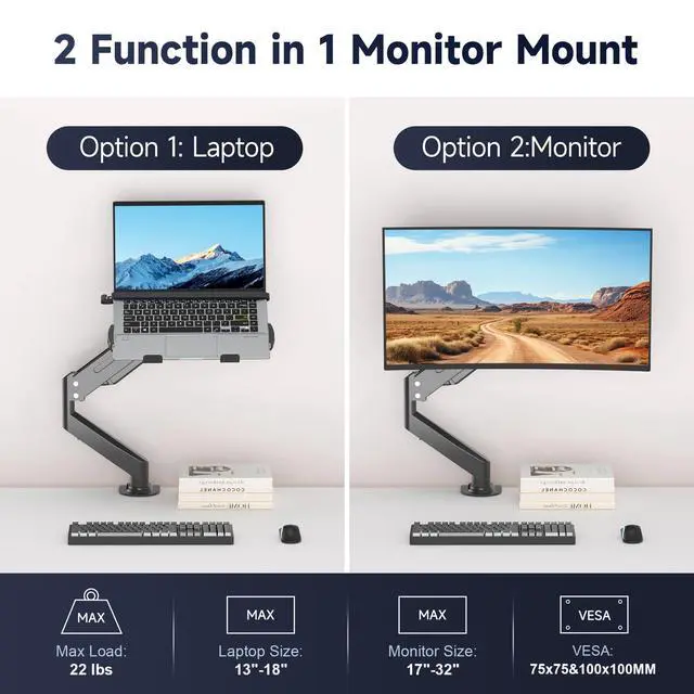 Space Saving - The 2 in 1 Function laptop monitor mount has internal cable management pass-through features to organize wires and cables.This monitor arm stand can mount both monitors and laptops.