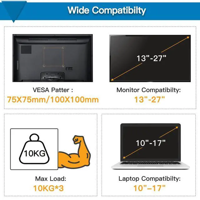 This dual monitor stand with laptop mount widely fits two 13 to 27 inch flat/curved computer screens with VESA 75x75 and 100x100, the laptop tray fits 10 to 17 inch notebooks, weighing up to 22lbs.