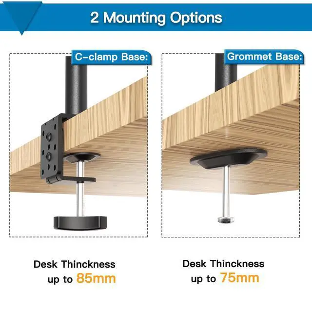 -The grommet mount boasts maximum security and inserts through a pre-installed opening in your desk. Simple hand tightening is all that's required for this mounting option as well. The 2 in 1 monitor mount stand's grommet fits desks up to 3" in thickness.