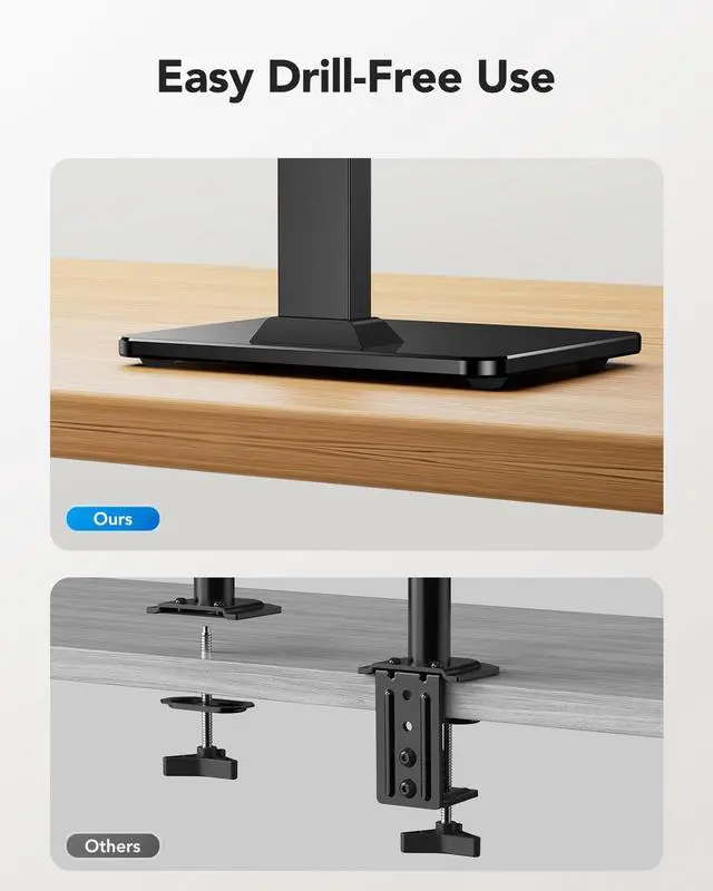 This monitor stand provides a simple solution for flexible viewing. Compared to grommet or wall mounting, assembly of this stand is much easier with no drilling required. Simply place the stand in your work area to enjoy viewing freedom instead of sitting in only one position.
