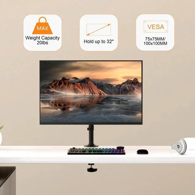 Single Monitor Mount: This single monitor arm fit most for 13-32 inch screens, each monitor arm weight up to 22lbs, fit VESA 75x75mm or 100x100mm backside mounting holes. Cable management clips can make your cable become tidy.
