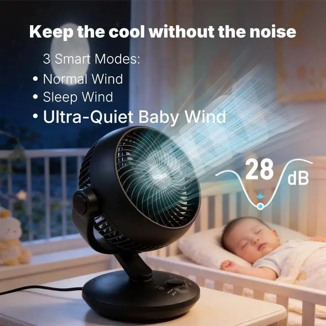 Unrivaled Ultra-Quiet Sleep Desk Fan: Experience truly undisturbed rest with our whisper-silent fan. Featuring a dedicated <28dB Ultra-Quiet Baby Wind Mode, it ensures peaceful sleep for sensitive adults, babies, and children the ultimate quiet fan for bedroom. 60-second auto screen-off eliminates light pollution.