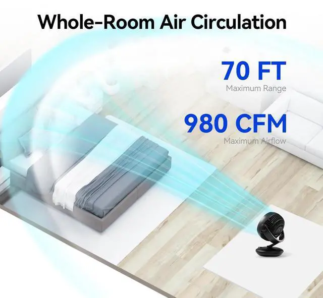 Powerful Cooling & Wide-Area Air Circulation Fan: Dont let size fool you! This small fan blows cold air up to 50 feet. Enjoy 85° automatic horizontal oscillation and manual 100° up/down tilt to eliminate dead spots, evenly distributing air in bedrooms, offices, or dorms. Perfect room fan for bedroom, table top fans for bedroom, or dorm fan. Weighing only 2.8 pounds, this portable fan moves effortlessly wherever cooling is needed.