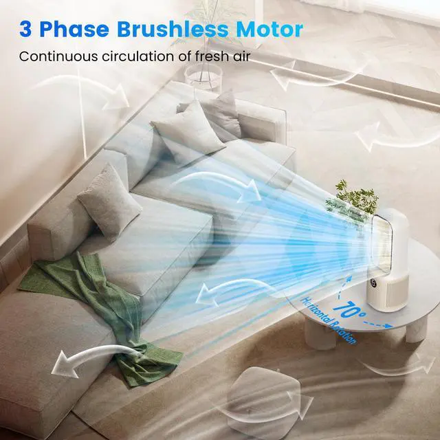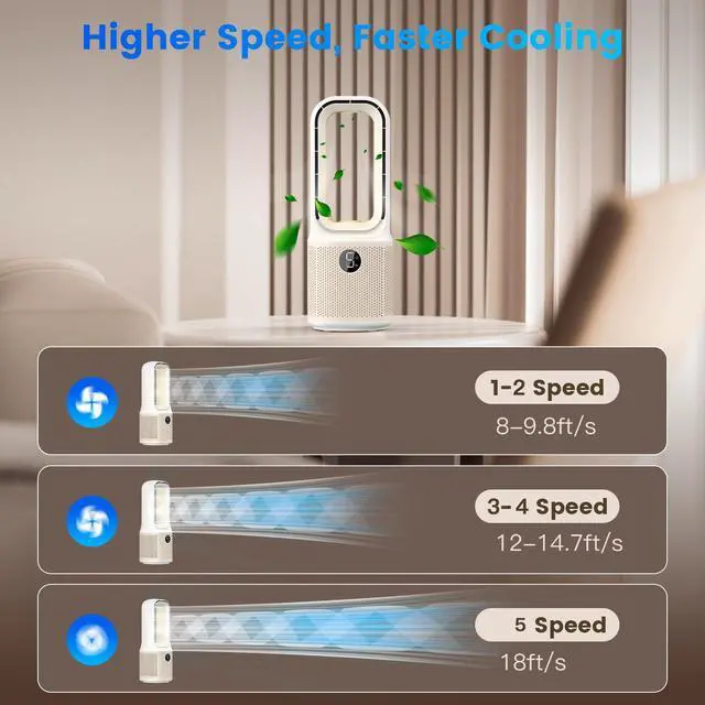Functional than traditional bladeless fansOur breakthrough dual-turbine boost system, enhanced by advanced aerodynamics, generates 60% more airflow than traditional bladeless table fans. Delivering powerful, focused wind with max speeds up to 18 ft/s, it accelerates indoor air circulation. Perfectly compatible with AC systems, it ensures cool and consistent comfort in every corner of the room.