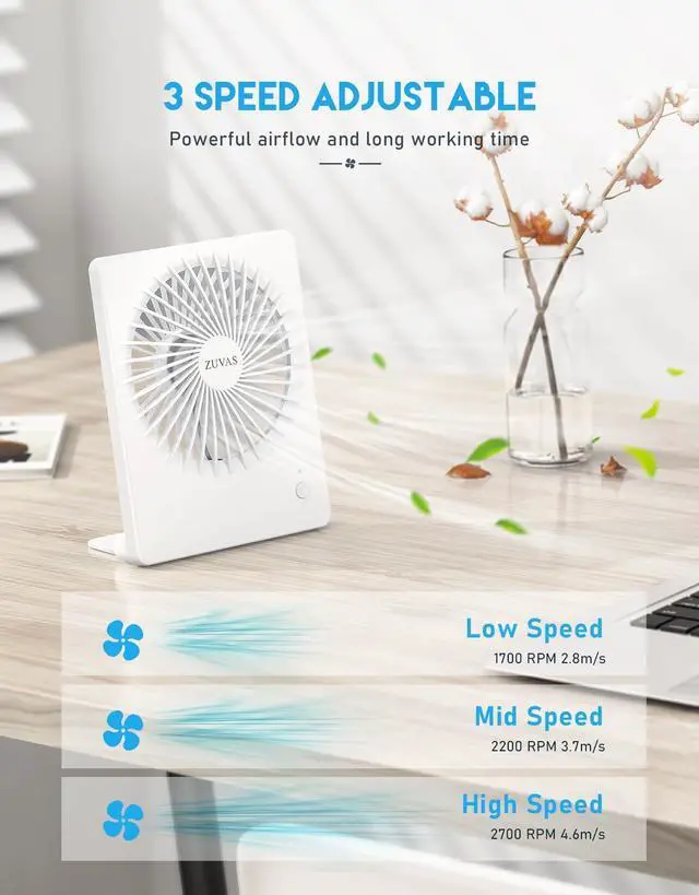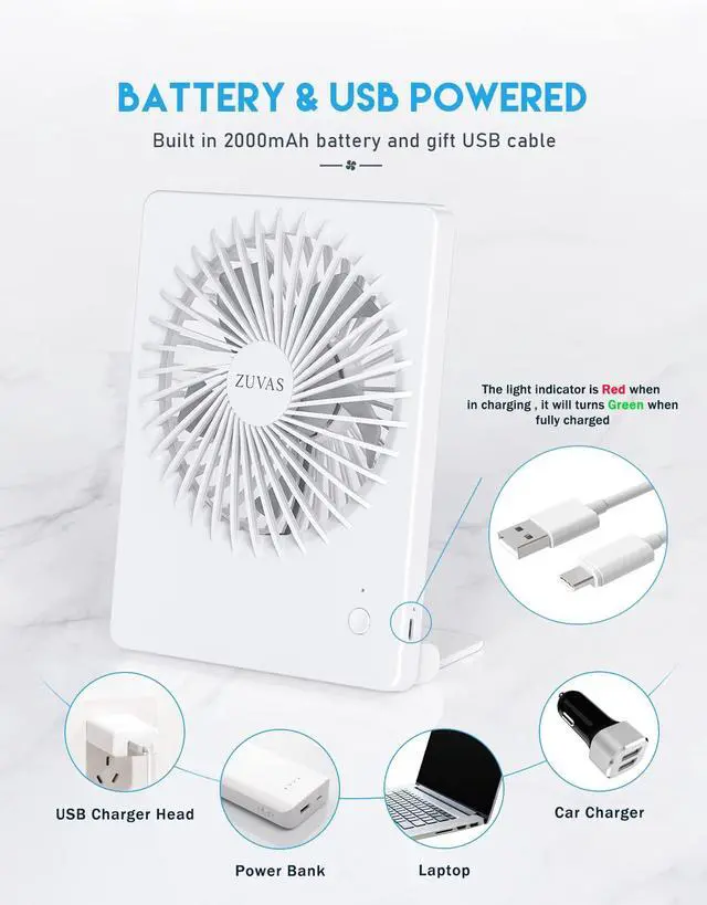 | 2000mAh Battery | The rechargeable fan is built in 2000mAh battery (unreplaceable), and it can also be powered by USB. |