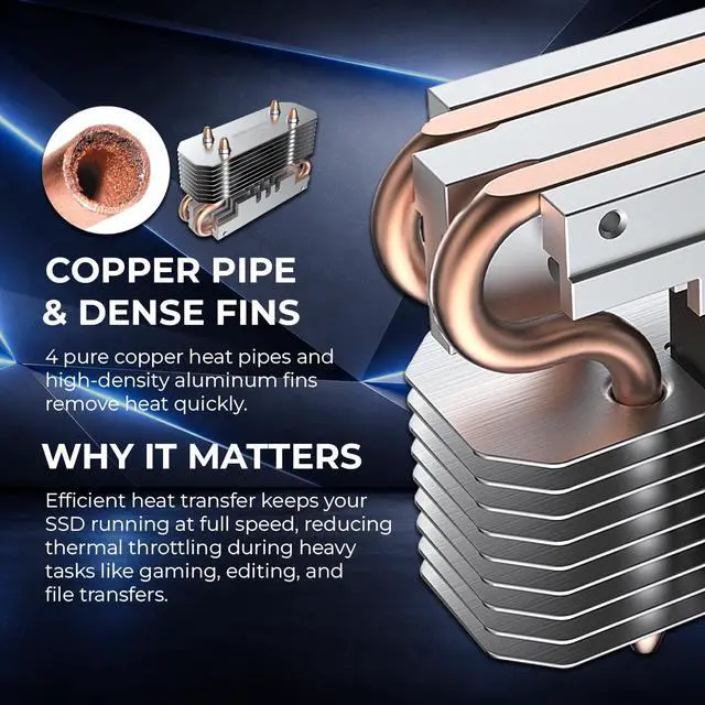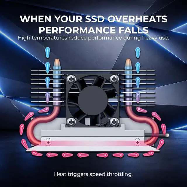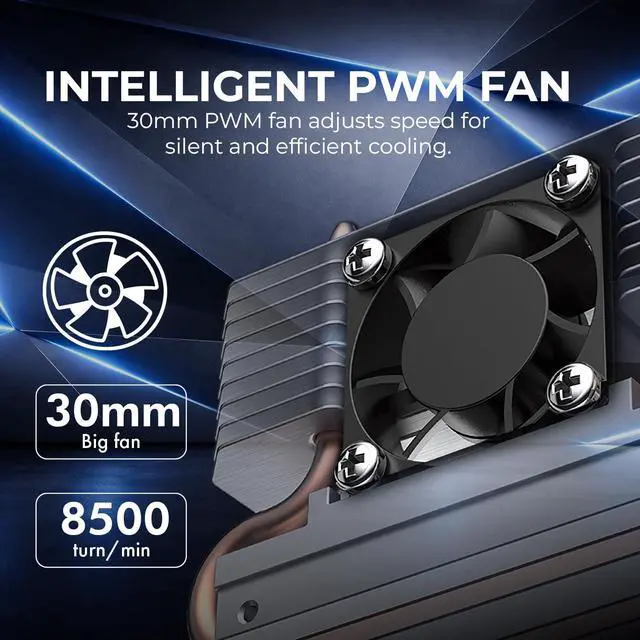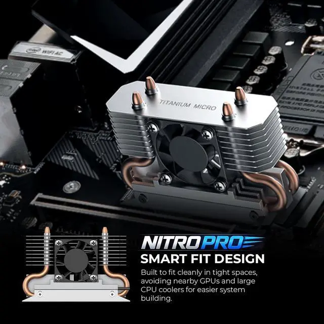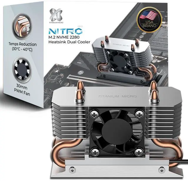 The Nitro Pro SSD Heatsink demonstrates significant cooling capabilities. During rigorous testing, the Nitro Pro, equipped with its advanced cooling technology, consistently reduced the temperature of M.2 NVMe 2280 SSDs by an impressive 30°C. This drastic temperature drop is achieved through the combination of pure copper heatpipes and the high-efficiency fan, which ensures excellent heat transfer and dissipation. In comparison, traditional heatsinks without a fan showed significantly higher operating temperatures, often unable to manage the heat generated during intensive tasks. The results clearly indicate that the Nitro Pro's integrated fan plays a crucial role in maintaining optimal SSD performance and longevity by effectively managing and reducing thermal loads.