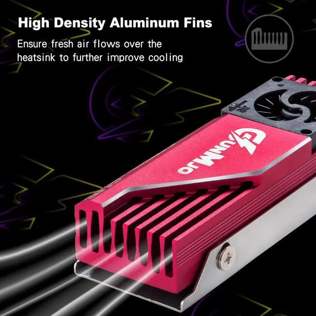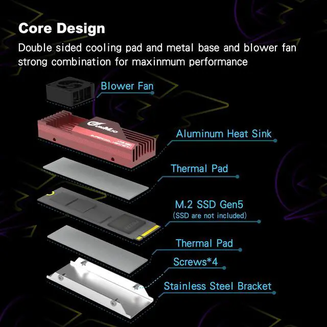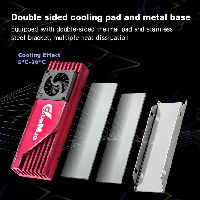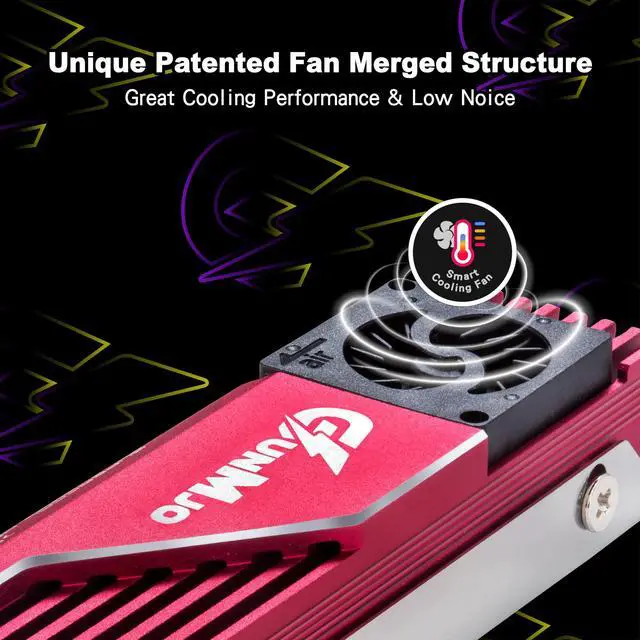 Unique patented fan merged structure : advanced and unique technology breakthrough with a compact Blower fan which has 12000 RPM/min, 60000 hours life, cooling effect 5°C-30°C (depending on the environment). Cooling your SSD to a safe temperature, to avoid overheating and throttled
