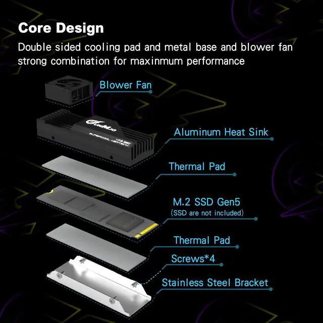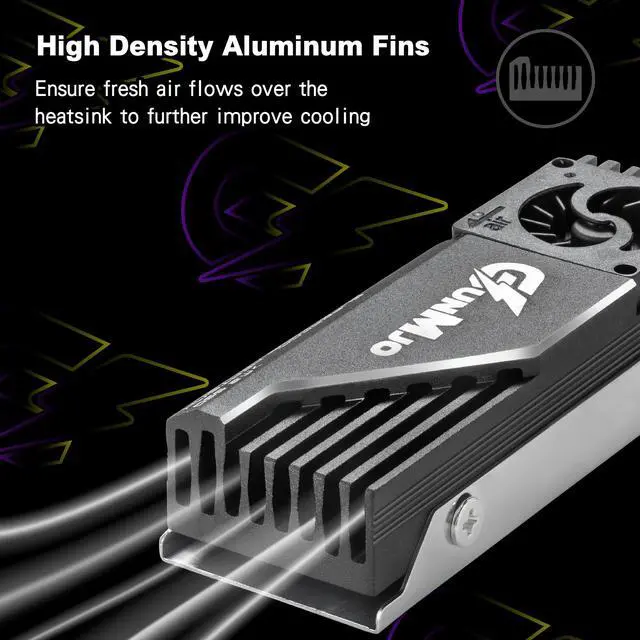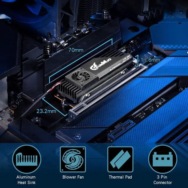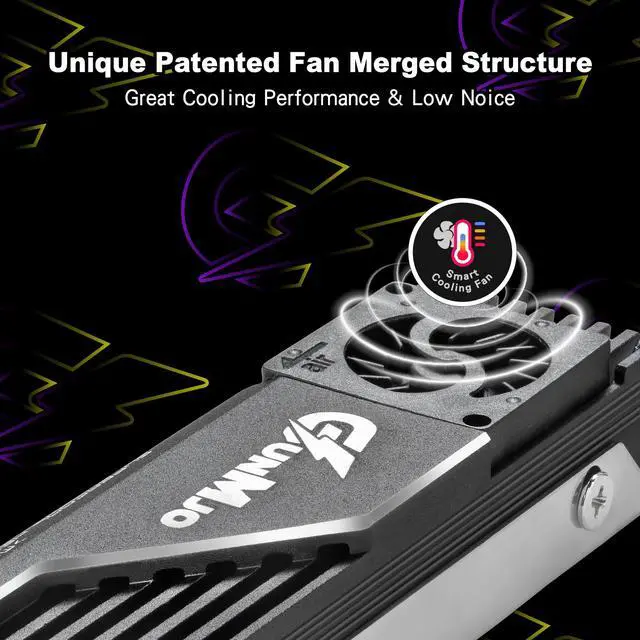 Unique patented fan merged structure : advanced and unique technology breakthrough with a compact Blower fan which has 12000 RPM/min, 60000 hours life, cooling effect 5°C-30°C (depending on the environment). Cooling your SSD to a safe temperature, to avoid overheating and throttled