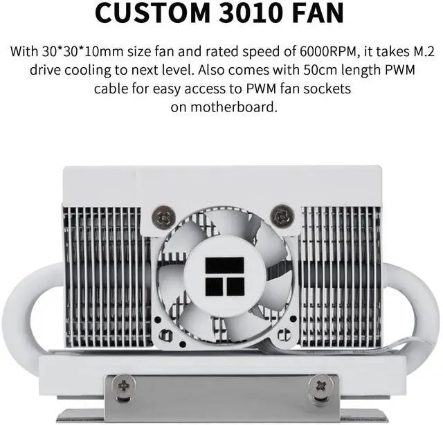 [Intelligent Temperature Control Fan] The fan size is 30mm x 30mm x 10mm, supports 4Pin PWM temperature control function, and can automatically adjust the speed according to the SSD temperature. The speed is between 3500~6500±10% RPM, which can not only provide strong cooling wind power at high temperatures, but also maintain low noise operation at low temperatures. Matched with 50cm ultra-long wire.