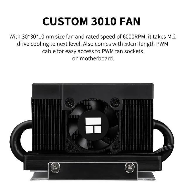 [Intelligent Temperature Control Fan] The fan size is 30mm x 30mm x 10mm, supports 4Pin PWM temperature control function, and can automatically adjust the speed according to the SSD temperature. The speed is between 3500~6500±10% RPM, which can not only provide strong cooling wind power at high temperatures, but also maintain low noise operation at low temperatures. Matched with 50cm ultra-long wire.