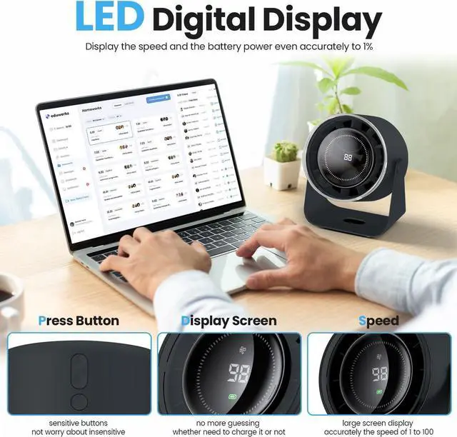 Smart LED Digital Display: This small desk fan features an elegant LED screen displaying battery life and speed levels with 1% accuracy. Powered by a 3600mAh rechargeable battery, it runs up to 8 hours on low speed, ideal for camping, travel, or outdoor use. Easily adjust wind speed and monitor battery status, ensuring youre never caught off guard. A stylish, practical choice for staying cool anywhere!