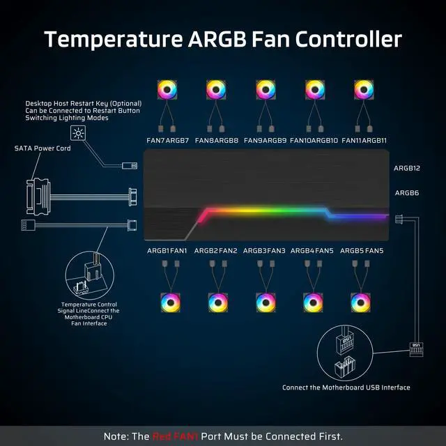 12 ARGB & 10 PWM Dual Ports All-in-one hub for PC case lighting and fan speed control, meets all DIY expansion needs with one device, no messy extra controllers.