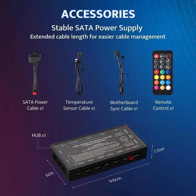 120mm fans x3, controller hub x1, remote x1, SATA Power Cable x1, Temperature Sensor Cable x1, Motherboard Sync Cable x1 and mounting screws.